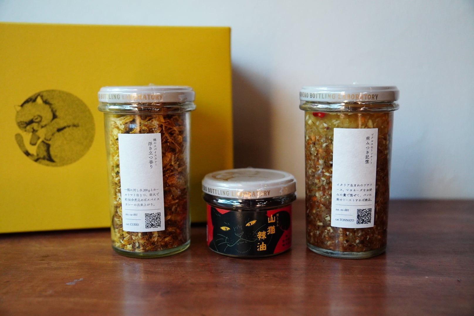 山猫瓶詰研究所の拠点である鹿児島県枕崎市の特産品鰹節を使った旨みの強い瓶詰商品3種のクリスマス限定ギフトセット。